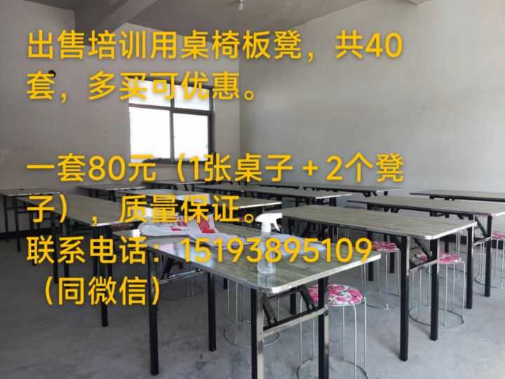 低价出售培训用桌椅板凳,一套80元(包含1张桌子+2个凳子)。共计40套,多...